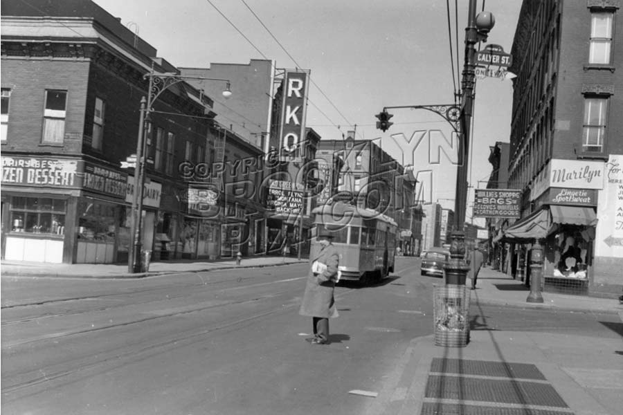 Greenpoint Avenue looking north at Calyer Street (See Marilyns) and RKO Greenpoint Theater, 1950 (1)