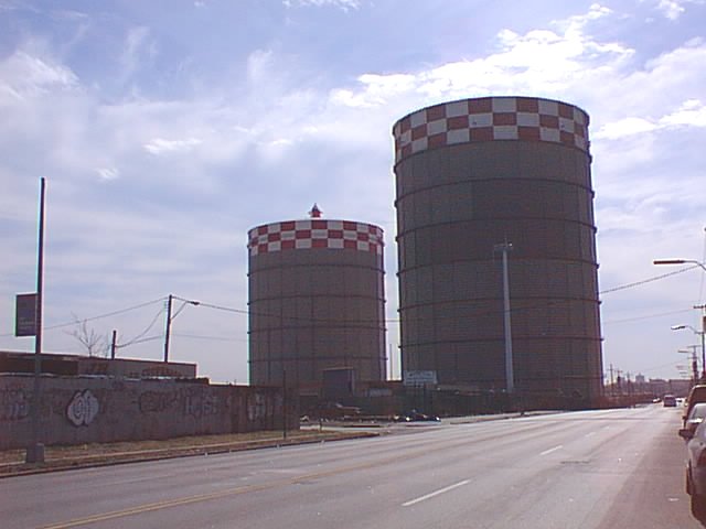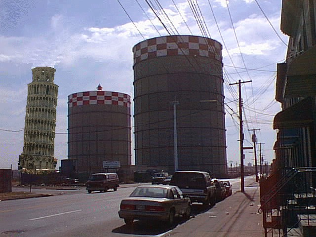 March 1999 - TANKED AGAIN: Seems that certain Greenpoint politicians are pushing to have the "red & white" BUG tanks located on Vandervoort Avenue removed. These "landmarks" visible from everywhere are empty now ----- I suppose that the Leaning Tower of Pisa picture in the WHAT IF section of GREENPOINT MAGAZINE might soon be a collectors item!